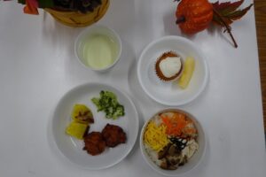 誕生日会食は『 鶏飯 』『 さつま揚げ 』『 さつま芋のレモン煮 』 『 ブロッコリー 』。 おやつは『 栗のカップケーキ 』『 りんご 』 でした。